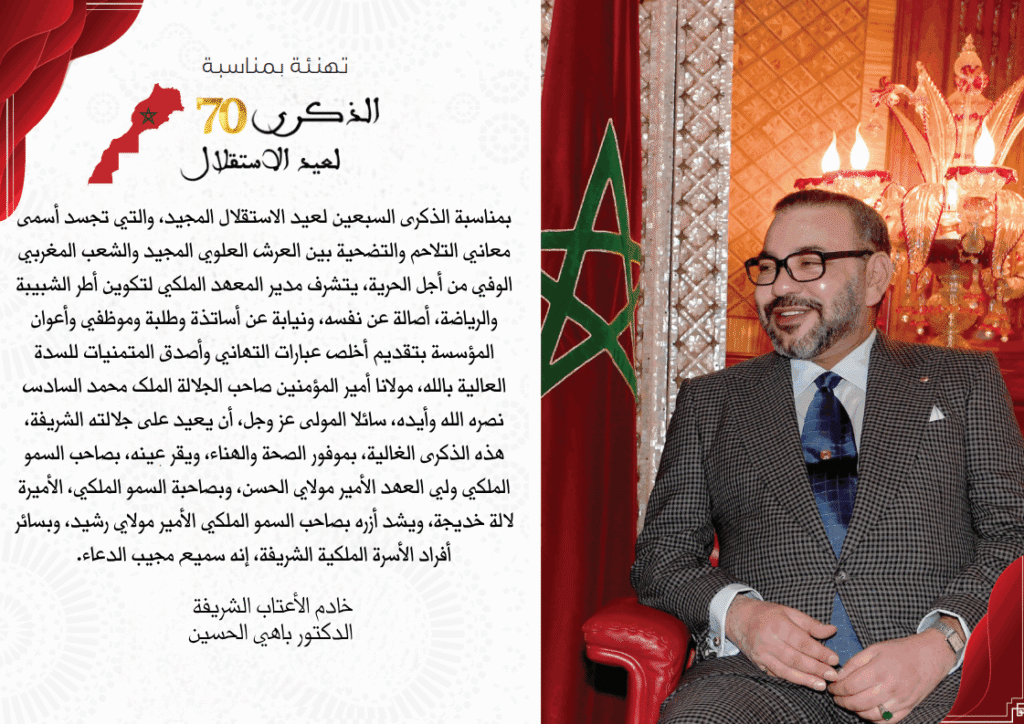 Home / Actualités et événements / تهنئة بمناسبة الذكرى السبعين لعيد الإستقلال المجيدActualités et événementsتهنئة بمناسبة الذكرى السبعين لعيد الإستقلال المجيدPar Med ghraibi Aucun commentaire17 novembre 2025 18:12 Share ArticleÉtiquetté :Actualités et événementsPrevious Articleتهنئة بمناسبة الذكرى الخمسين للمسيرة الخضراء المظفرةMed ghraibi Related Posts تهنئة بمناسبة القرار التاريخي لمجلس الأمن بخصوص الصحراء المغربية ... 3 novembre 2025 Liste des candidat(e)s retenu(e)s définitivement pour la formatio ... 28 octobre 2025 Avis de Réinscription à la formation doctorale en sciences du spo ... 1 octobre 2025