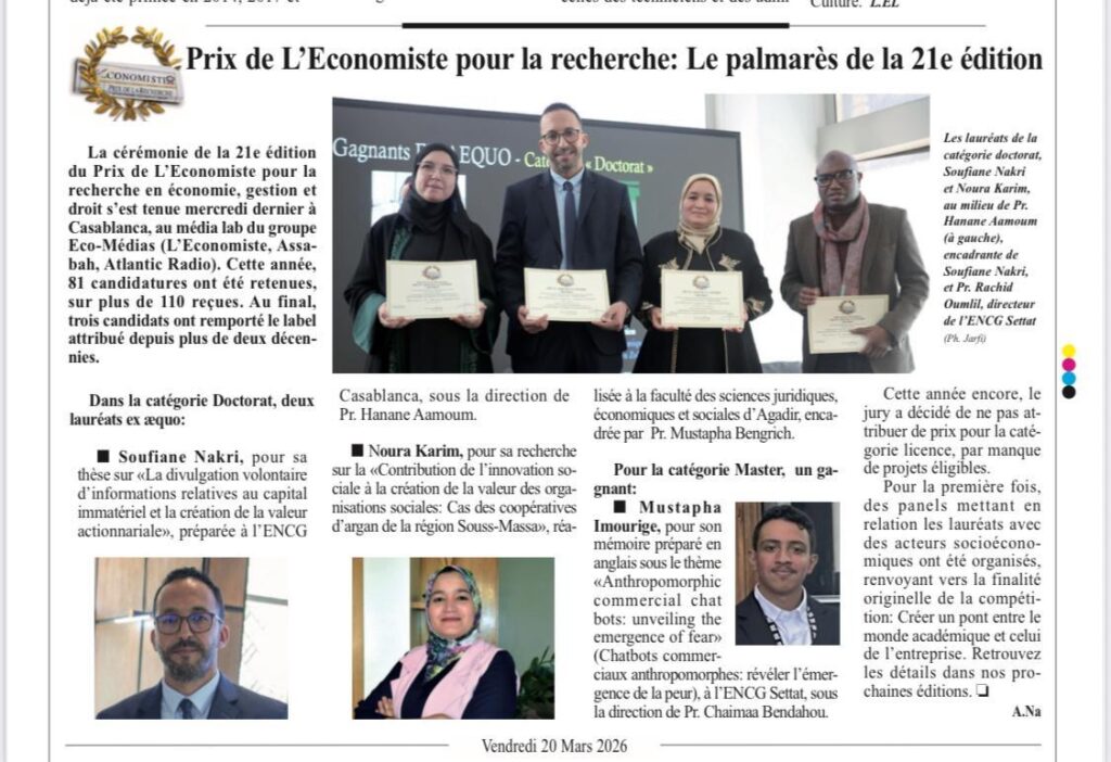 1L’IRFC/JS félicite le Professeur Soufiane NAKRI pour sa distinction au Prix de L’Économiste24 mars 2026
