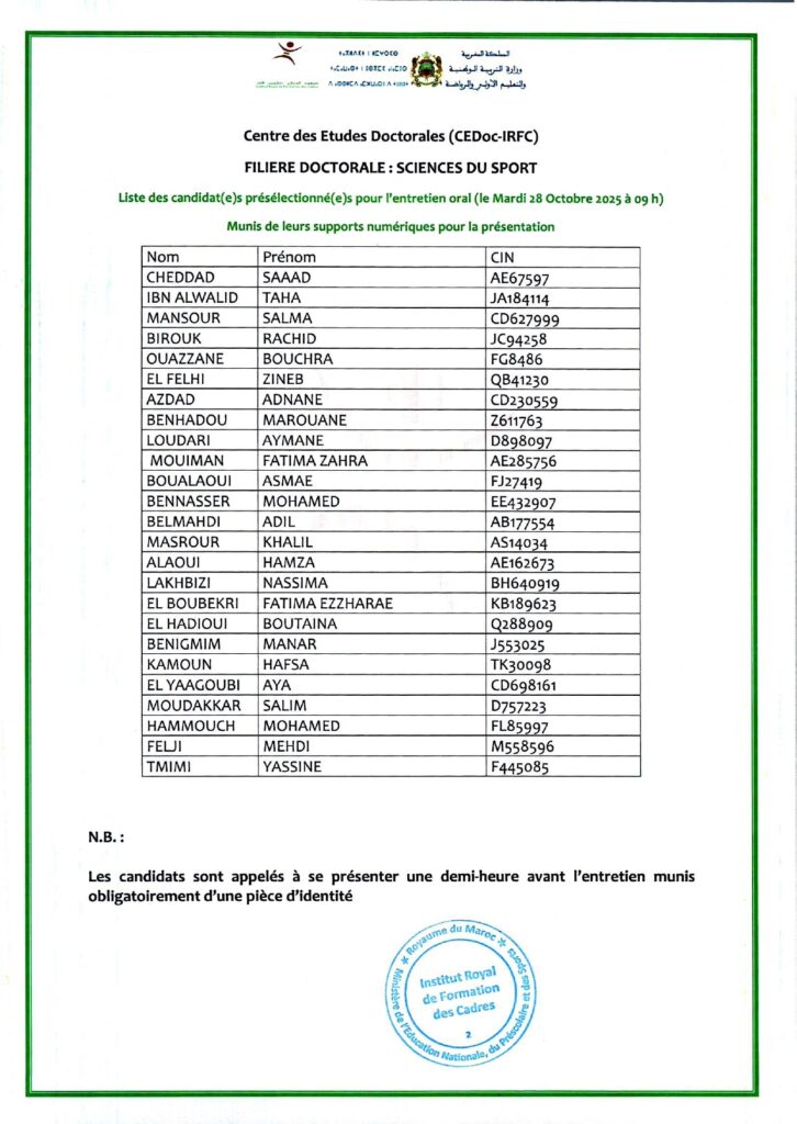 Liste des candidat(e)s présélectionné(e)s pour l’entretien oral année universitaire 2025-2026